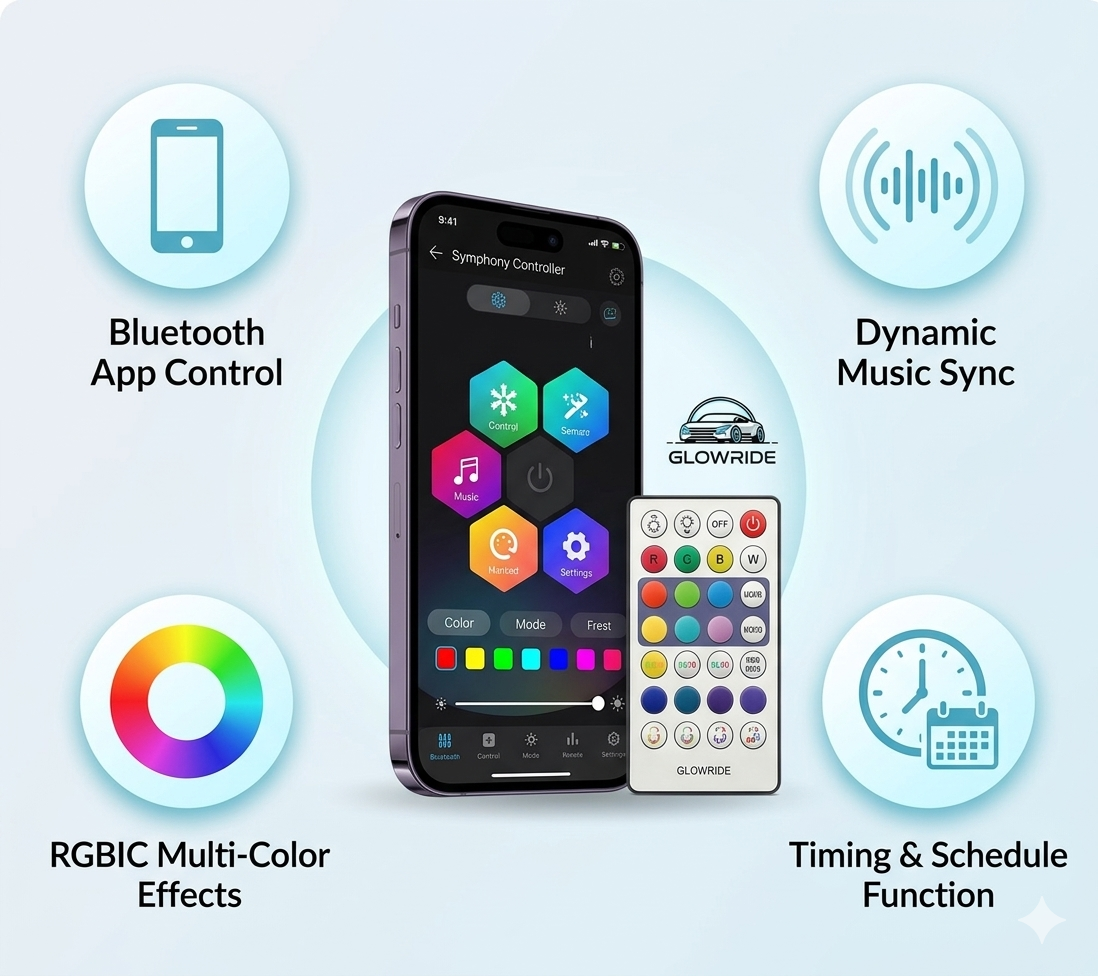• Set the Vibe with Music Sync: Turn your drive into a party—GlowRide™ lights sync to your music, pulsing to the beat for an immersive, energetic ride.